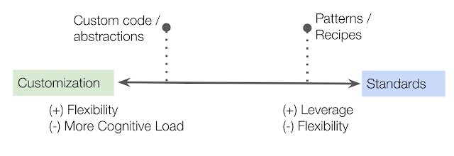 Patterns are standards. I have some issues with the word standard because people take anti-patterns, and bad code, bad decisions that are everywhere and call standard but besides that, patterns are standards. Now, sometimes standards will let you down, will introduce inefficiencies, and will not be the right solutions, some problems require different solutions, especially problems at scale. When the standard is right, you gain leverage but might lose flexibility. By deciding to design something custom you might gain flexibility but with the cost that will increase cognitive load since people will need to make sense of your code.